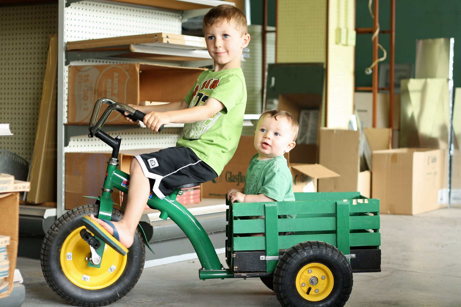 This morning we went and visited my grandma at my dad's hardware store here in town. The boys love to burn some energy by running/riding around the store and screaming. I remember doing the same thing when I was their age :) Here they are causing trouble this morning.
