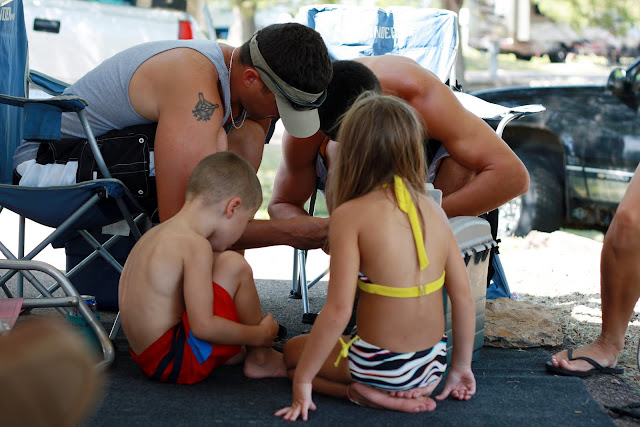 We had a great time at the lake last weekend. Late Thursday evening we dropped Cruz off with his grandma and grandpa - they live on the way - and arrived at the lake around 10 pm. We ended up staying up until about 1 am that night...not a good idea for Bo, he was a little out of his mind when it was time to lay down. We ended up sleeping in my parent's camper, my younger brother insisted on sleeping in a tent with a window ac unit. The next morning we were awaken at the butt crack of dawn by the glaring sunlight coming in the camper windows. We would not make the mistake again of not covering windows with blankets and towels so we could at least sleep til 8 am the next morning. After a breakfast of bacon and eggs, the men headed out on the boat to fish, while we women headed to the beach to swim with the kids. After only about an hour and a half the kids were exhausted from the heat and asking to go back up to the camper.